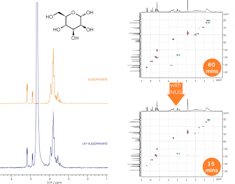 Các mũi cộng hưởng được định danh dễ dàng. Càng hiệu quả hơn khi bạn kết hợp các xung RF định dạng sẵn để ức chế tín hiệu dung môi, khi phân tích những hợp chất khó như đường hoặc thậm chí tinh bột hòa tan trong nước.