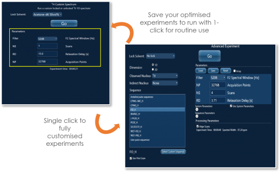 Phần mềm SpinFlow mới giúp bạn dễ dàng sử dụng thiết bị X-Pulse. Các phép đo "nhanh" được lập sẵn để bạn làm việc thường xuyên hàng ngày như phổ 1D, 1H cơ bản, 13C, DEPT, chỉ với một cú nhấp chuột. Giao diện cho phép người dùng có kinh nghiệm lưu chuỗi xung và thông số của riêng họ để chạy lại lần sau, đảm bảo chương trình đo nhất quán và giảm thời gian thu thập dữ liệu.